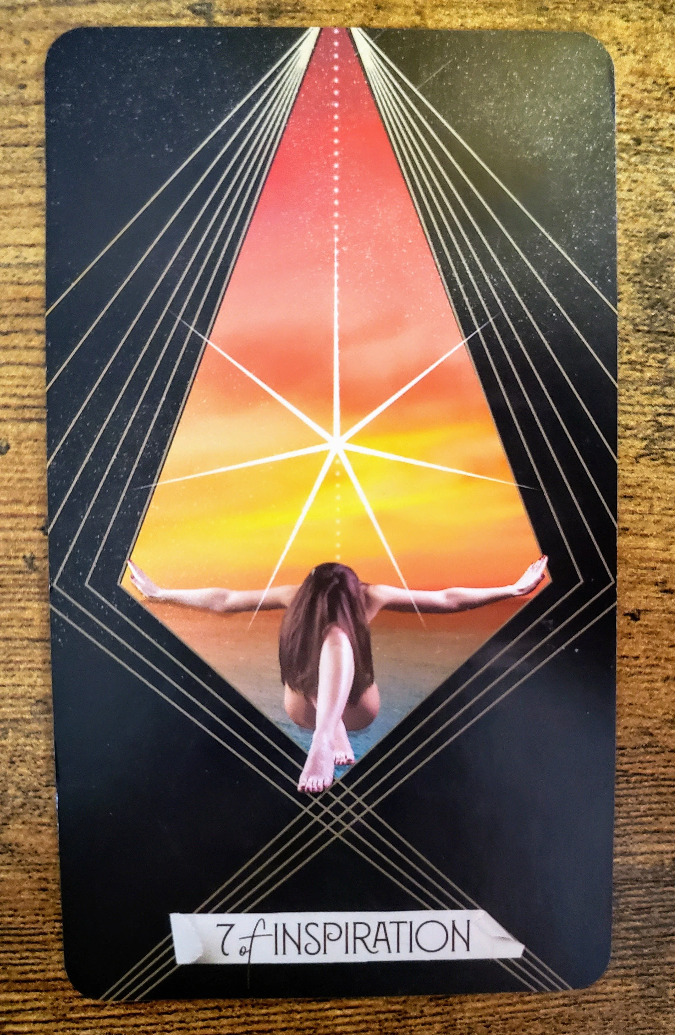 7 of Inspiration from The Muse Tarot by Chris-Anne. Or 7 of Wands from the traditional tarot.
